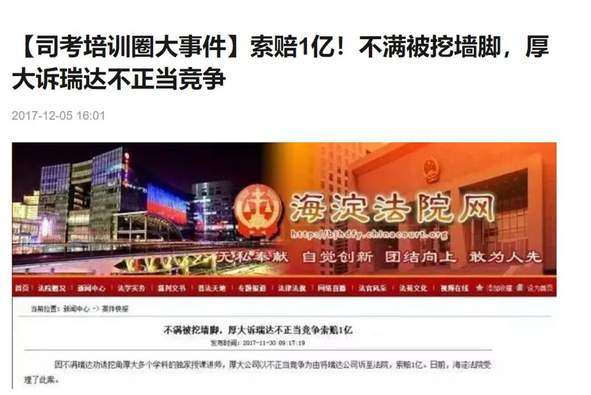2017年10月,厚大法考以“不正当竞争”为由,向北京市海淀区人民法院起诉瑞达法考,涉案标的人民币一亿元,其诉称:瑞达法考存在“挖角”行为,且挖取上述名师给厚大造成严重经济损失,同时,在班次、分校设置、图书名称等方面,也构成不正竞争。