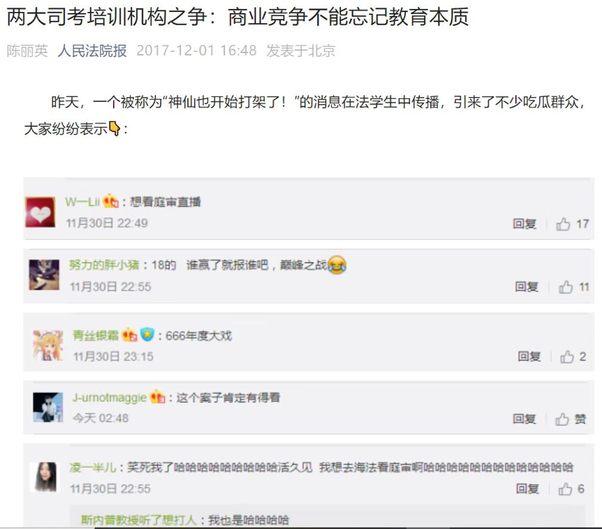 由于两大培训机构知名度很高,且涉及诸多法考名师,该案一起,在法律圈引发热议,被称为“法考培训领域第一案”,甚至有网友戏称:“神仙打架”、“谁赢了就报谁”、“巅峰之战”。